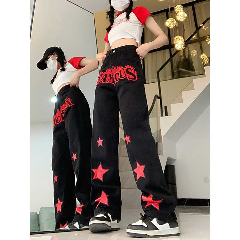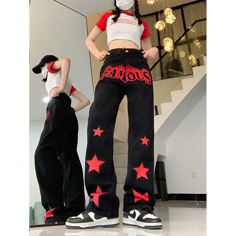 Red Star Letters Jeans For Women High Waist Casual Trousers