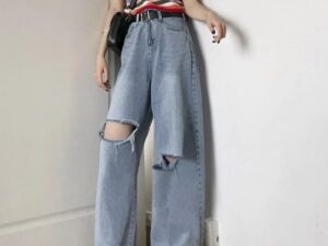 Loose Slimming High Waist Student Straight Knee Ripped Jeans Women